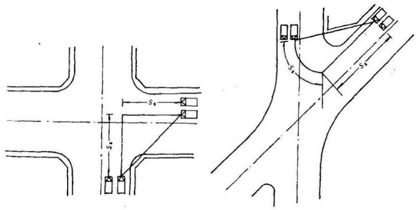 16.1.2 城市道路用地紧张,往往交叉口的设计不注意视距三角形的验算,植物和建筑一样不得进入视距三角形。分隔带与路侧带上的行道树的枝叶不得侵入道路限界。弯道内侧及交叉口三角形范围内,不得种植高于最外侧机动车车道中线处路面标高 $1\mathrm{m}$ 的树木,弯道外侧应加密种植以诱导视线。